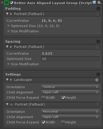 A Better Axis Aligned Layout Group works like a Horizontal- or Vertical Layout Group but supports different settings for different Screen Configurations (see Size Config Collections) as well as Size Modifiers for Padding and Spacing.