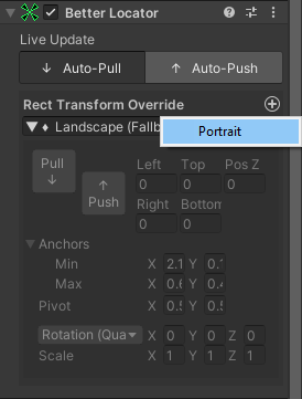 Now change to a portrait resolution (height > width). You will notice that the Landscape-Section collapsed in the Better Locator and the Portrait section expanded. This tells you that the Portrait screen configuration was detected and is active now. As long as "Auto-Pull" is toggled, any position / size or rotations changes are automatically applied to the Rect Transform Override of the currently active configuration.