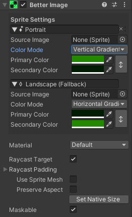 In the Sprite Settings of the Better Image, change the "Color Mode" to "Horizontal Gradient" and pick a second color. Then switch to a portrait resolution (The gradient will look wrong now). Hit the Plus-Button next to the Sprite Settings Header and select "Portrait". In the newly appeared settings change the Color Mode to "Vertical Gradient" and pick the right colors (don't forget to make sure that the alpha value is 1).