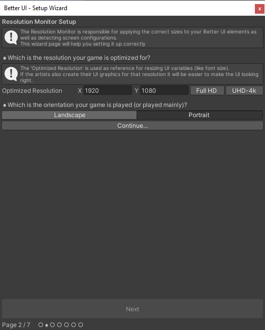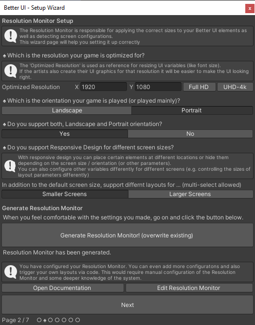 To set up the Resolution Monitor correctly, you are being asked several questions. Please read the question and info-boxes carefully to not make setup mistakes. You are able to change the settings later, but as soon as you have some Better UI components in place, changing the settings might affect the appearance in unexpected ways.