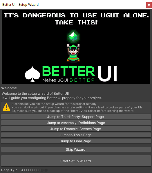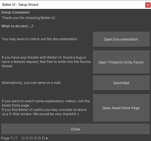 After importing Better UI into your project, a wizard window should appear guiding you through several pages in order to setup Better UI correctly for your project.