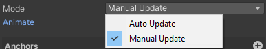 - Manual Update: The anchors are updated on enable (e.g. when it is instantiated) or when the resolution has changed. At other times it is not updated.