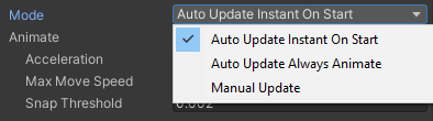 If "Animate" is checked, there are two kinds of auto-update-modes: - Auto Update Instant On Start: When the object is enabled (e.g. when it is instantiated) it will instantly apply the anchors. At later times it will animate.