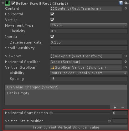 The Better Scroll Rect provides two extra fields: Horizontal Start Position and Vertical Start Position.