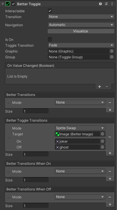 They function the same way as "Better Transitions" but have the states "On" and "Off" instead of "Normal", "Highlighted", "Pressed", "Selected" and "Disabled". Accordingly, they are triggered when the "Is On" state of the toggle changed. - Better Transitions When On Introduced in Better UI 2.5