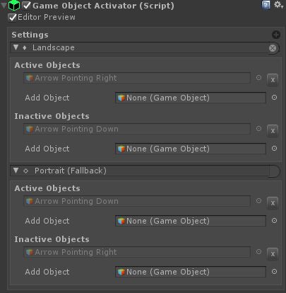 The Game Object Activator allows you to activate and / or deactivate (set active) game objects for certain screen configurations (see Size Config Collections).