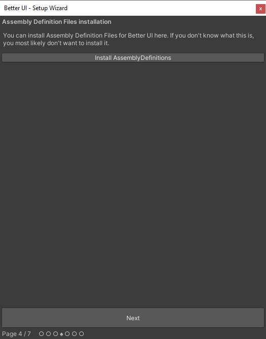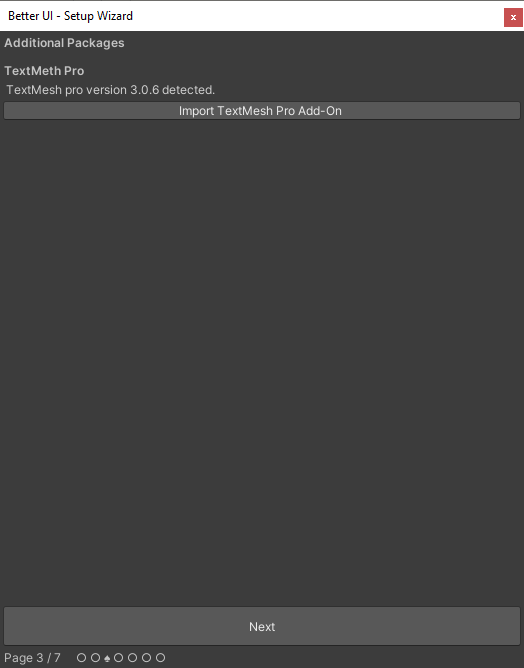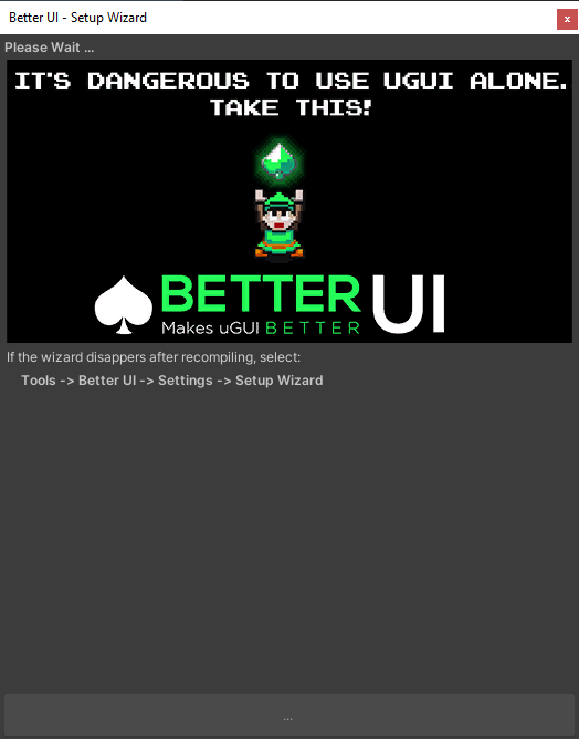 After importing Better UI into your project, a wizard window should appear guiding you through several pages in order to setup Better UI correctly for your project.