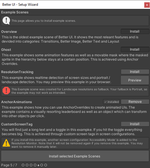 This Page allows you to install / remove example scenes. You can find all installed example scenes in the folder Assets/TheraBytes/BetterUI/Example.