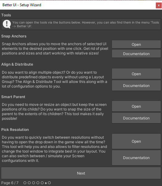 After importing Better UI into your project, a wizard window should appear guiding you through several pages in order to setup Better UI correctly for your project.