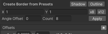 Defines a list of offset sprites behind the image. You can add as many entries as you like (the built in shadow uses one, the built in outline 4). The more entries you have, the smoother the result. Performance wise the number of entries has not a big impact as all the sprites are drawn in one batch.