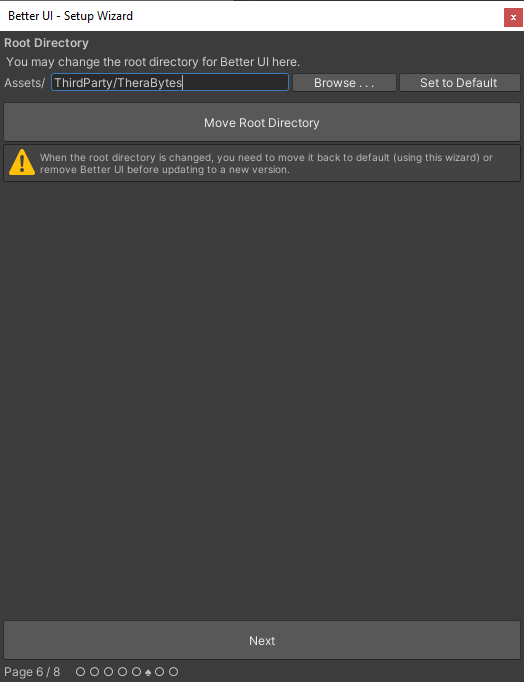 This page allows you to move the folders BetterUI, BetterUI_TextMeshPro, BetterUI_Examples and Resources to another folder. So, it is advisable to have a dedicated parent folder for them.