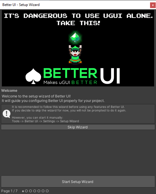 After importing Better UI into your project, a wizard window should appear guiding you through several pages in order to setup Better UI correctly for your project.